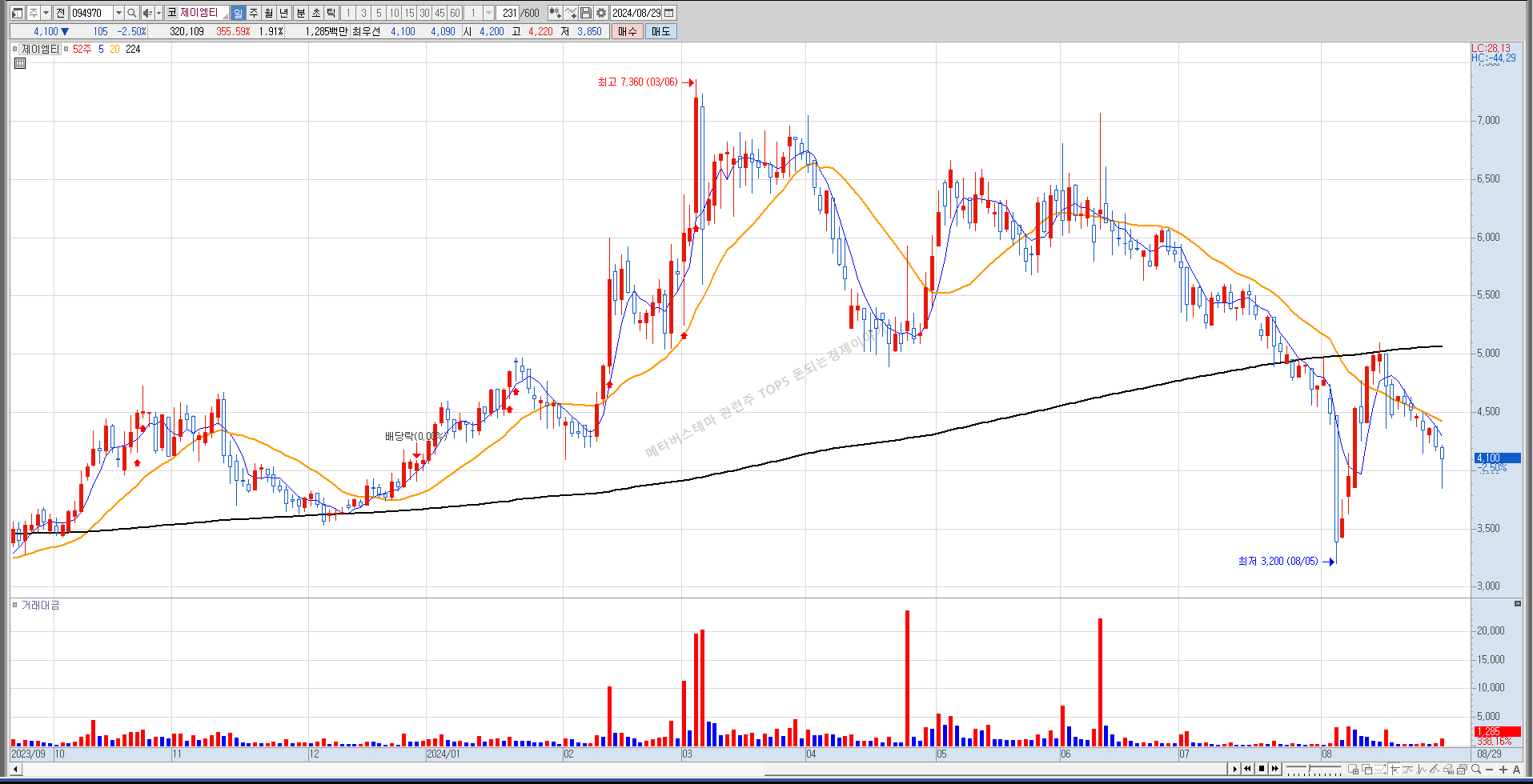 장초반 급등하면서 상한가로 직행, 풀리지않고 마감했습니다. 상장 이후 -88% 수준의 하락추세 이후 이슈와 함께 반등하며 장기이동평균선에 도전하는 모습입니다.