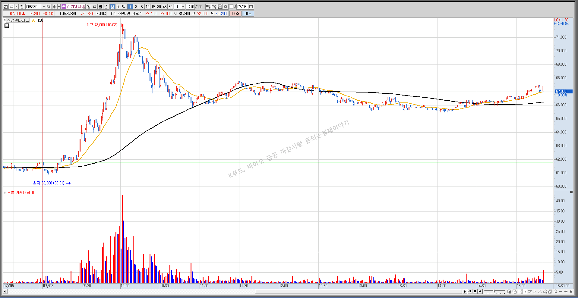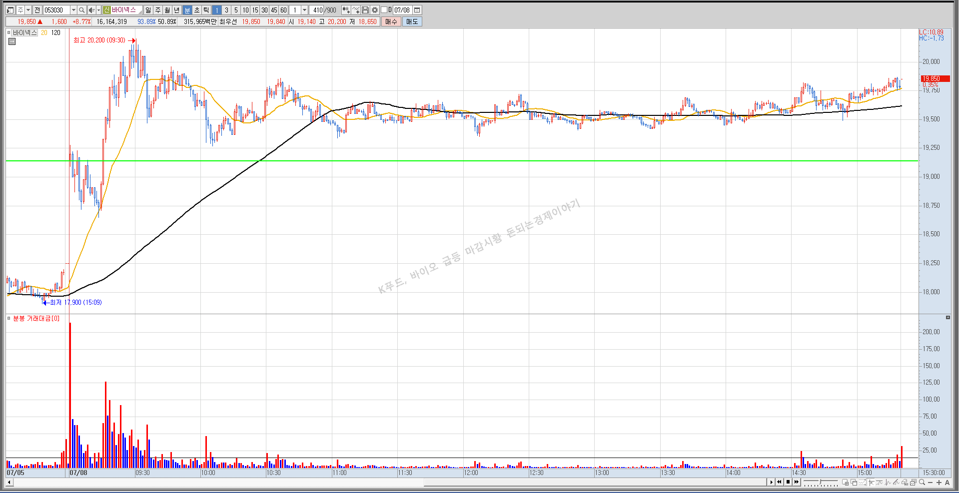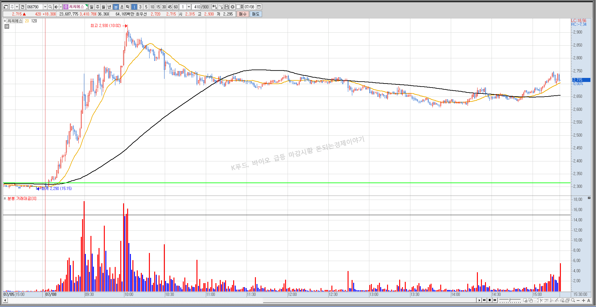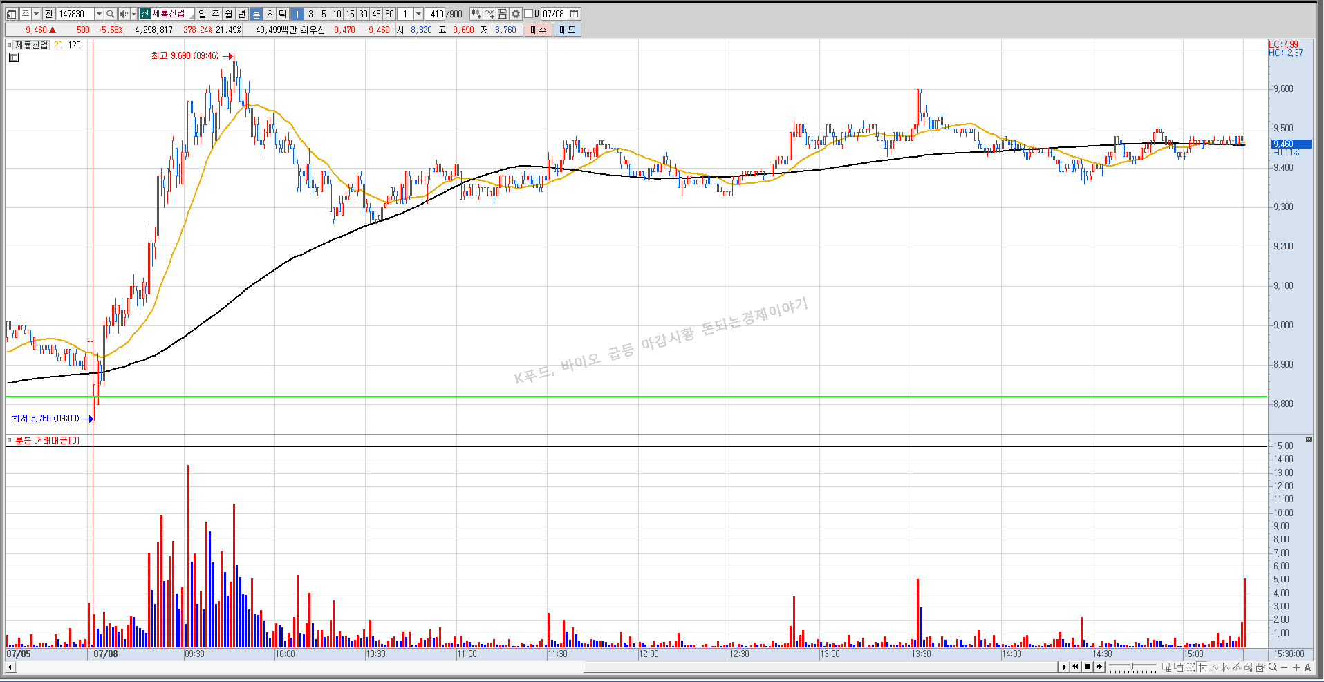 전체적으로 바이오, 푸드 테마가 강하게 움직이면서 시장의 대금을 가져간 것 같습니다.