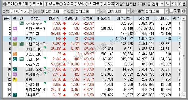 직전일 종가대비 상승률 상단에는 대부분 K푸드, 바이오테마가 자리 잡았습니다.